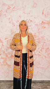 STIL: Lange, grob gestrickte Jacke aus einem mehrfarbigen Garnmix.
