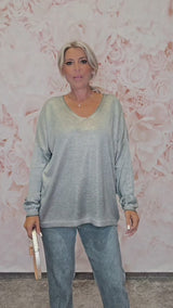 A versatile staple with a sophisticated touch. This fine maxi sweater with a gold metallic finish is perfect for adding a touch of light to any look. Its loose design with a V-neck and long sleeves makes it a comfortable, stylish, and flattering piece, ideal for both everyday wear and more chic occasions.