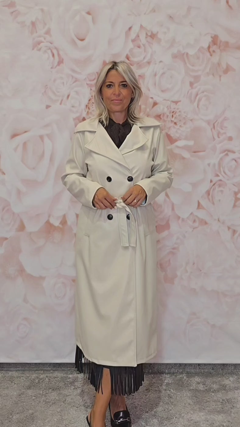 - DETTAGLI: Ampi revers, doppiopetto davanti, cintura abbinata, maniche lunghe