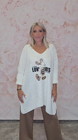 Comodo, ampio ed elegante. Questo maxi maglione marrone in maglia grossa si distingue per il suo design oversize con scollo a V e dettaglio frontale ricamato con la scritta "Love Paris" e un fiocco con stampa animalier. La sua vestibilità ampia lo rende un capo versatile e facile da indossare, perfetto per un look casual e rilassato.