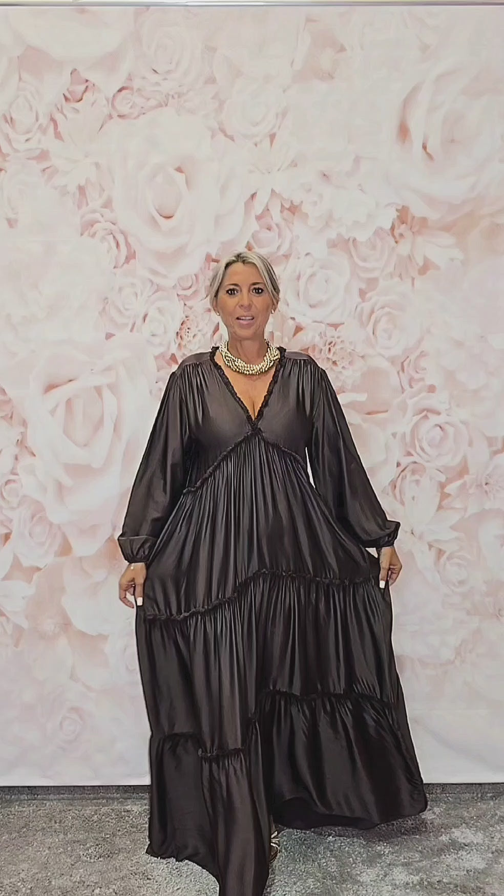 Un abito pieno di movimento e dallo stile bohémien. Il suo drappeggio fluido e la lucentezza del raso esaltano la silhouette con un tocco romantico e naturale. Ideale per distinguersi con eleganza in ogni occasione.