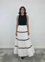 Gonna Veronica bianca. Cintura anteriore liscia. Cintura posteriore regolabile con arricciatura. Coulisse nera.