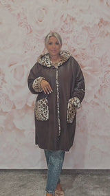 Una prenda envolvente y muy especial. Esta chaqueta combina el exterior en efecto ante con el interior en suave pelo estampado animal print, creando un contraste moderno y sofisticado. Su diseño con capucha, bolsillos y cremallera la hace práctica y muy cómoda para el día a día.