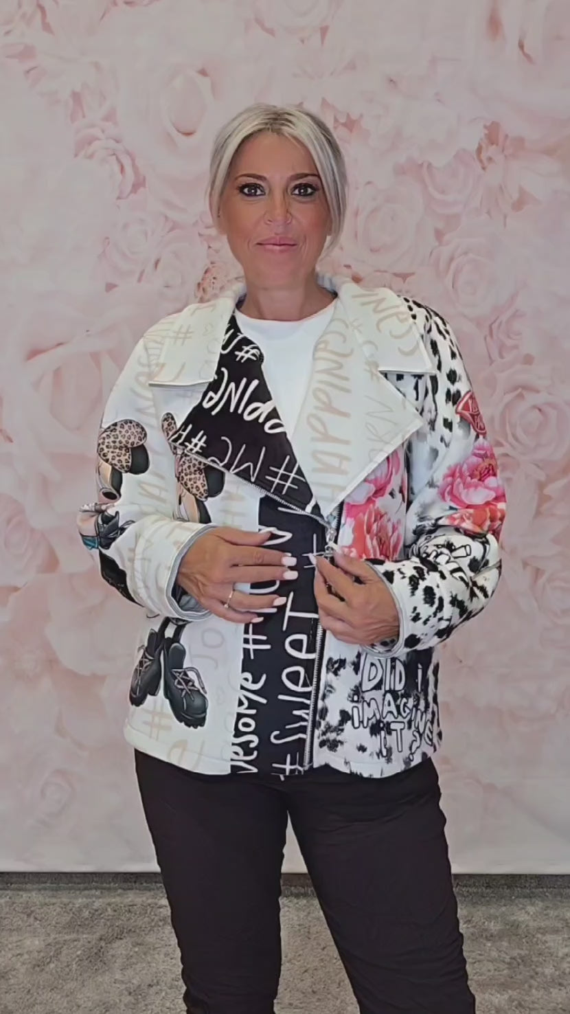 Una prenda única y con mucha personalidad. Esta biker está confeccionada en tejido de neopreno con acabado aterciopelado, que combina comodidad con un look sofisticado. Su estampado mezcla motivos gráficos, florales, animal print y detalles de Minnie en versión chic, convirtiéndola en una pieza llamativa y moderna.