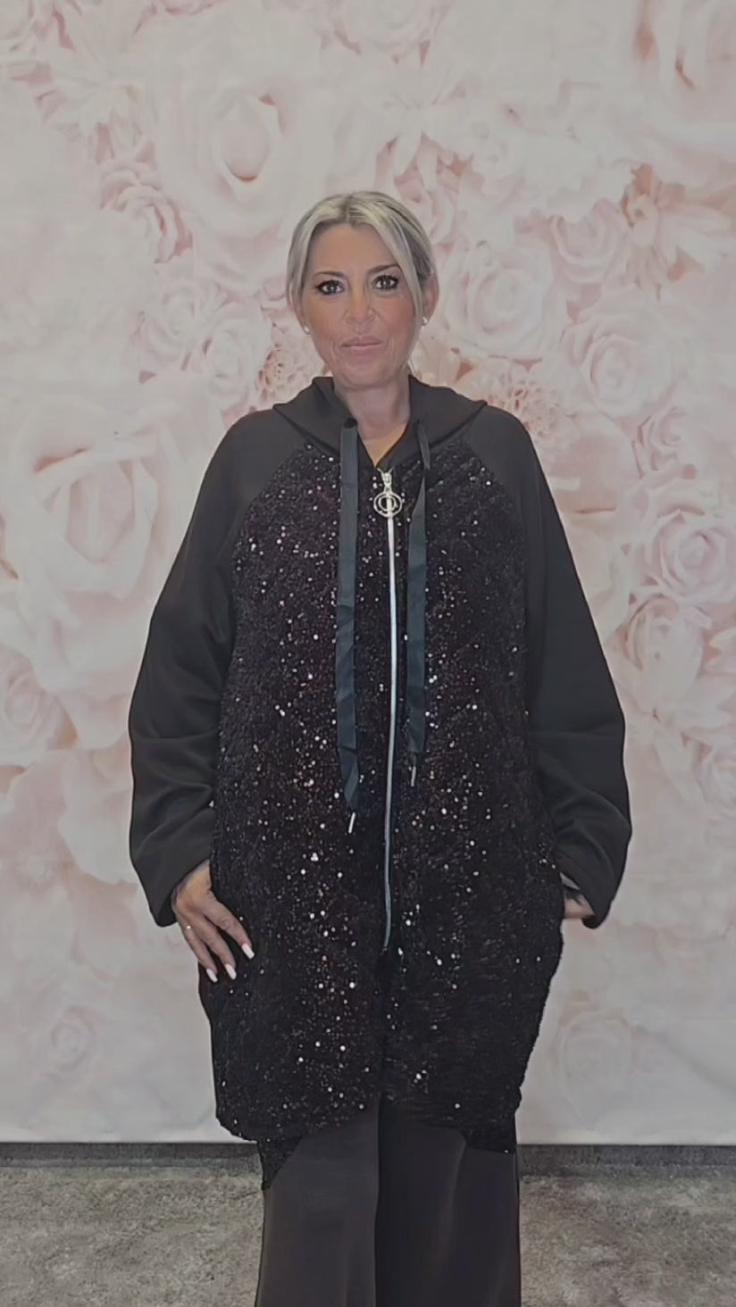 • DETALLES: Capucha ajustable con cordón, cremallera frontal, bolsillos laterales, cuerpo cubierto de lentejuelas y bajo asimétrico.