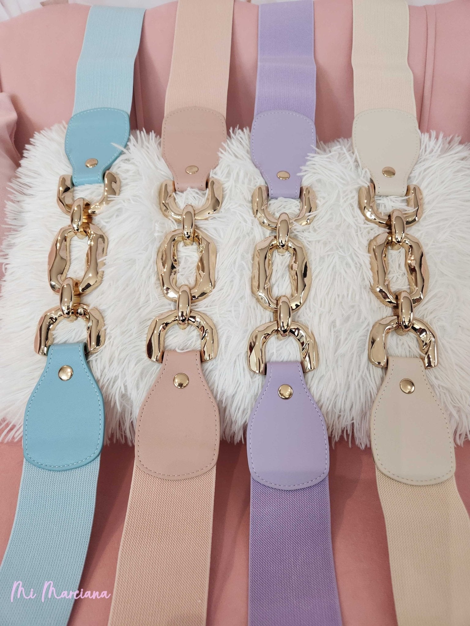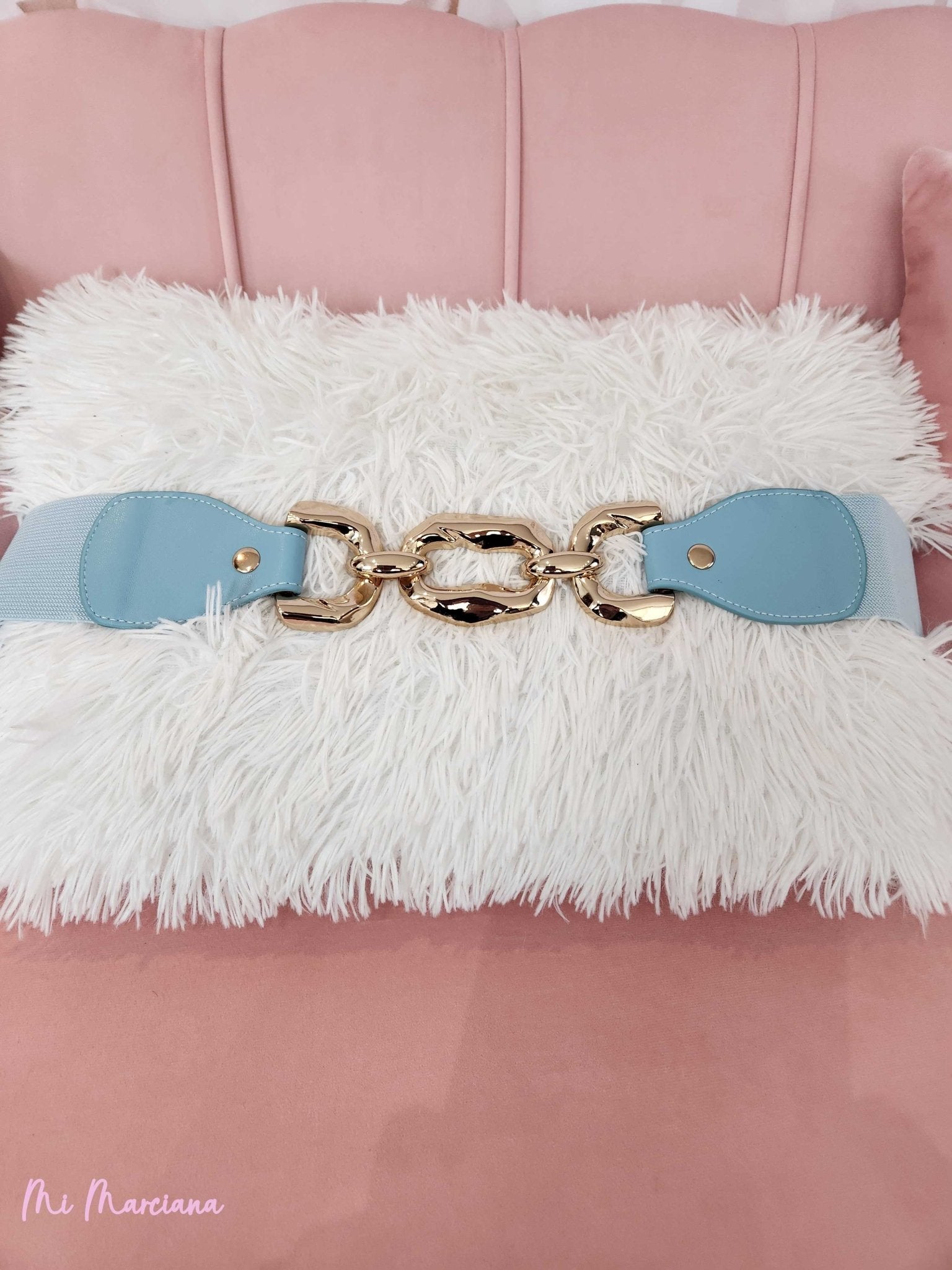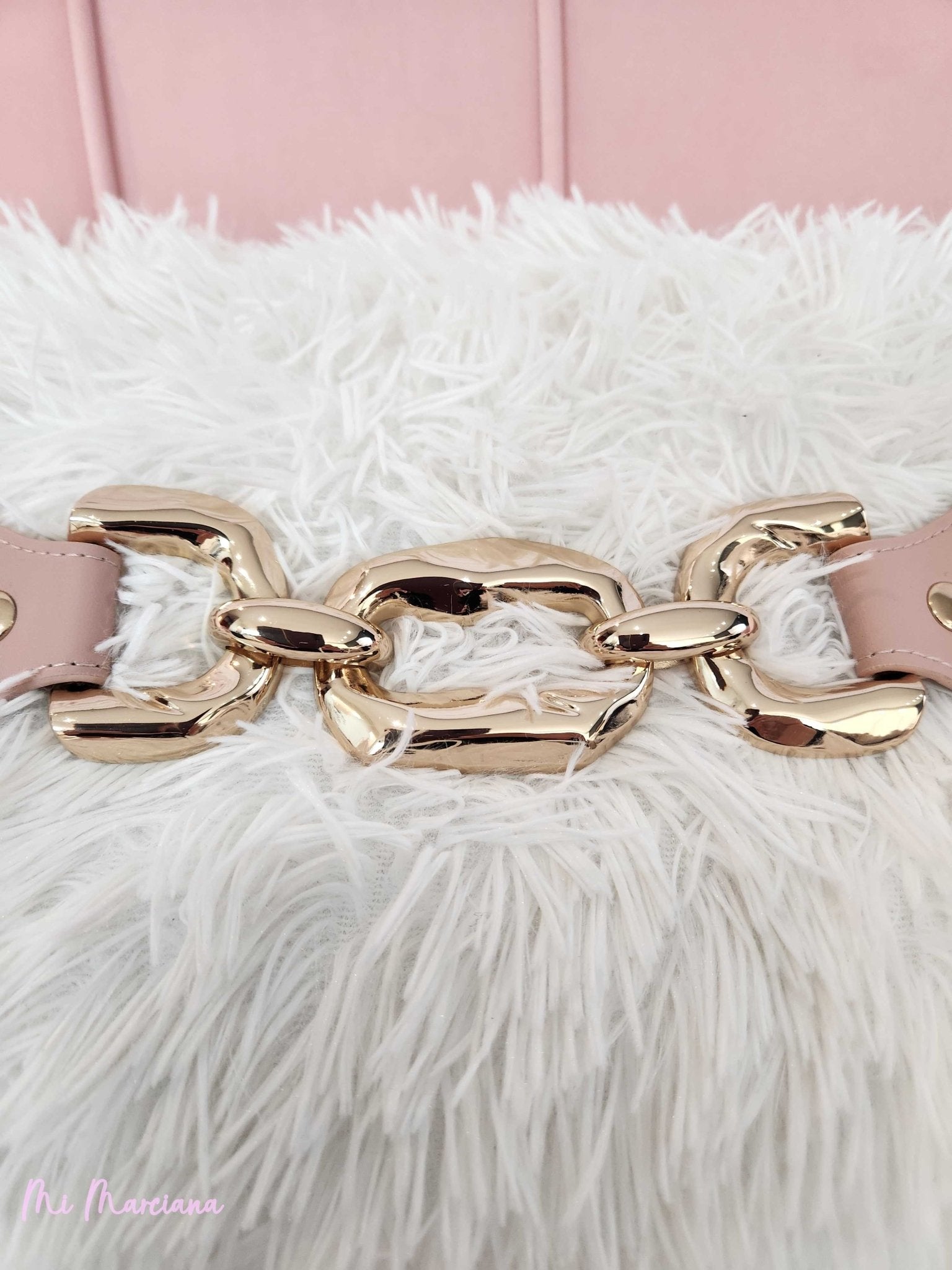 Cinturón eslabones dorado. Tela elástica. Se abrocha atrás con dos automaticos. Ancho 6 cm. Los complementos no admiten devolución
