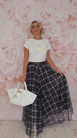 Falda con mucho movimiento y estilo, perfecta para dar personalidad a cualquier look gracias a sus capas de tul y su diseño de cuadros. Su cintura elástica y su caída fluida la hacen cómoda y muy favorecedora.