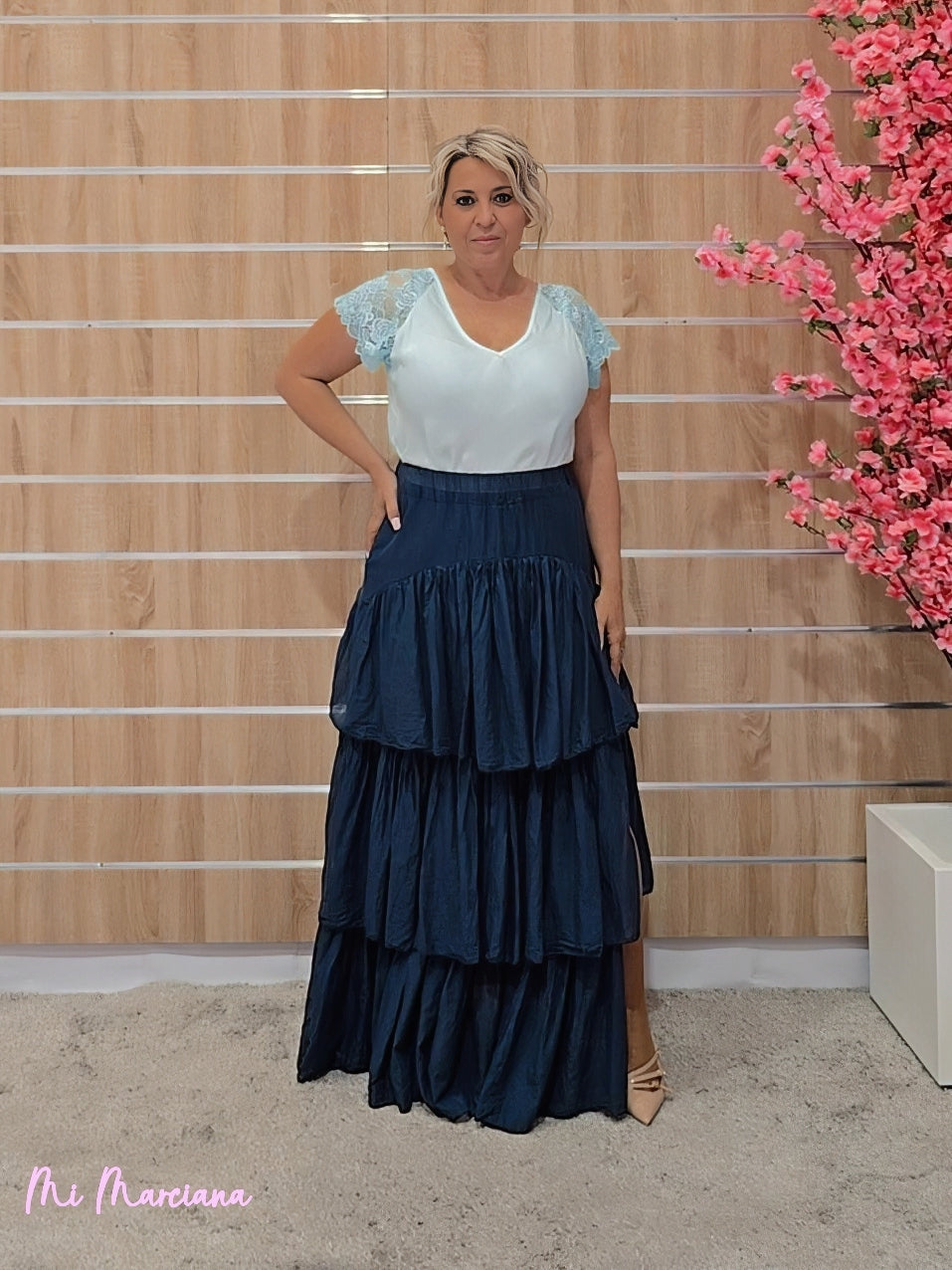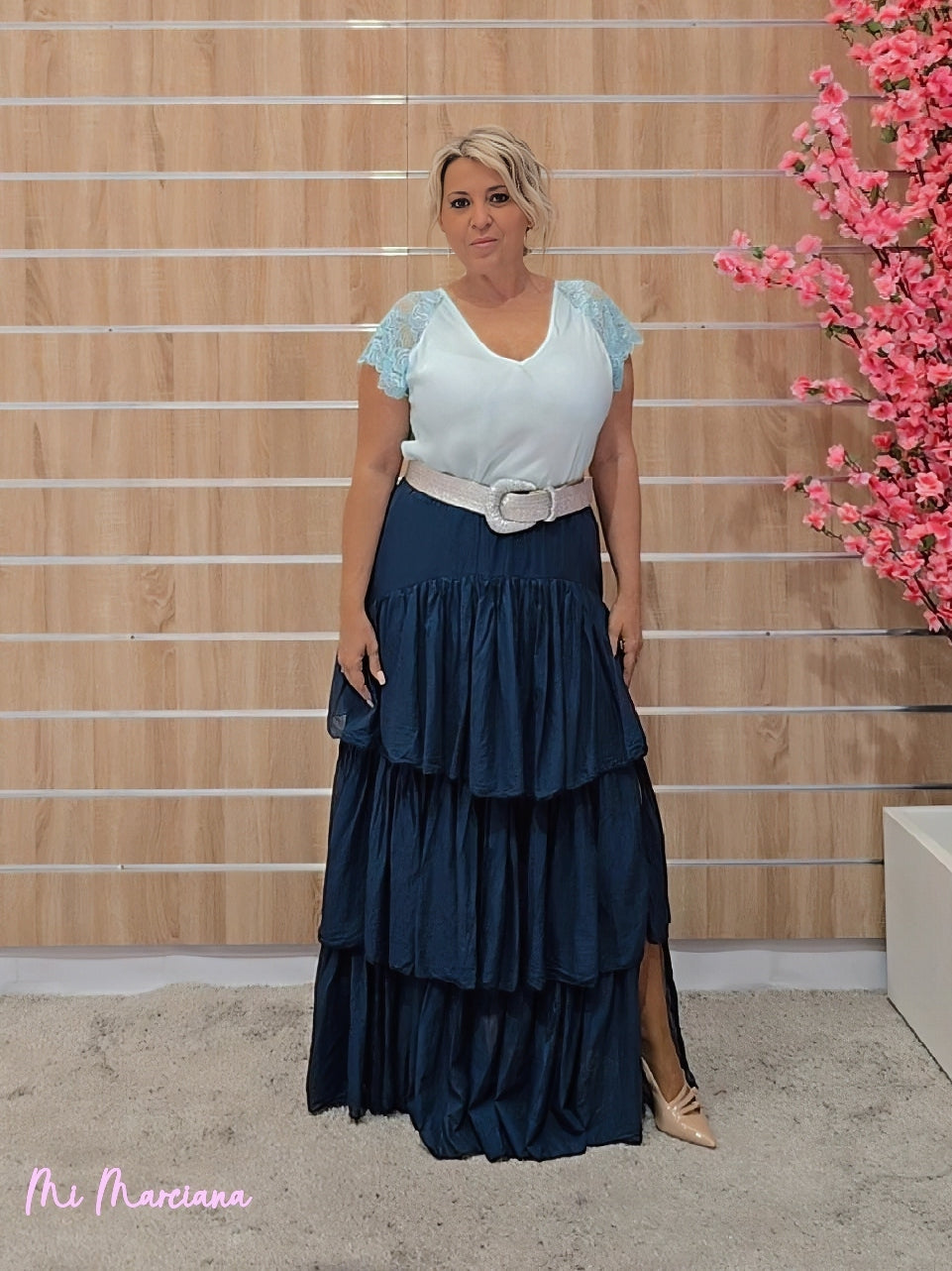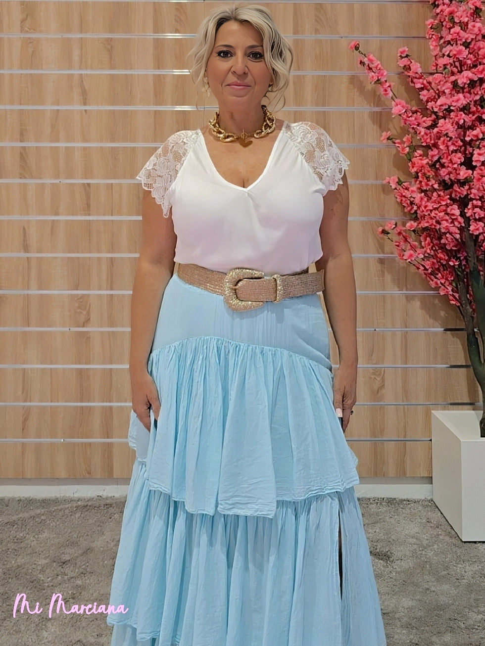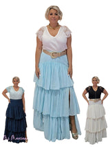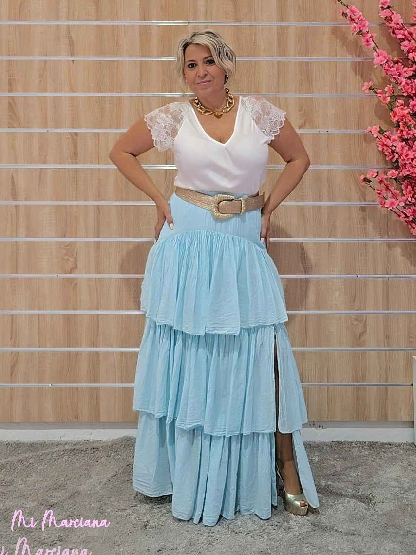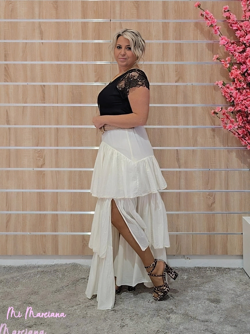 Esta falda larga confeccionada en gasa ligera destaca por su diseño fluido con múltiples capas de volantes. Cuenta con una cintura elástica fruncida que garantiza comodidad y una elegante abertura lateral. Incluye forro para mayor comodidad y opacidad.