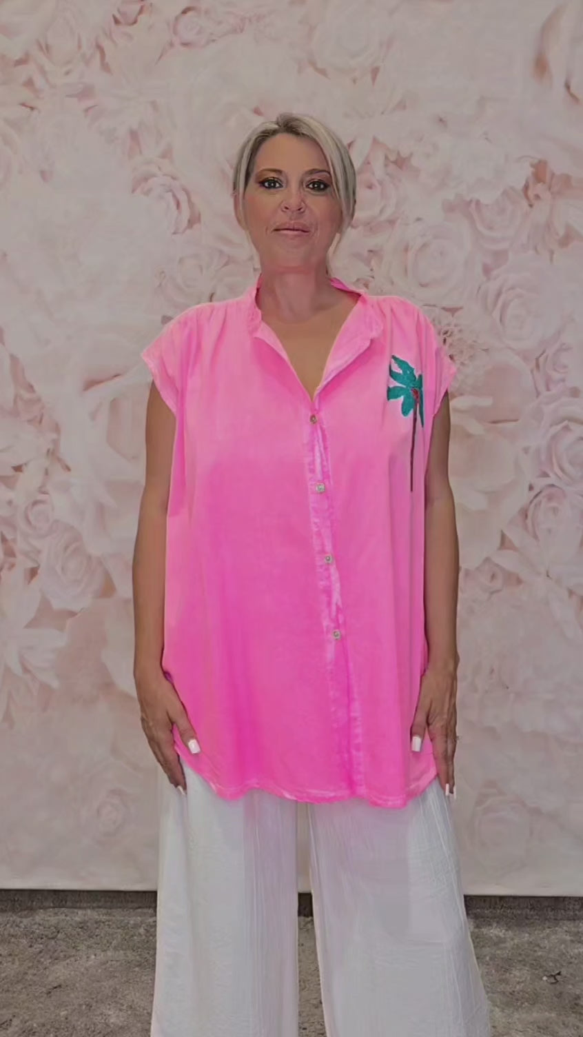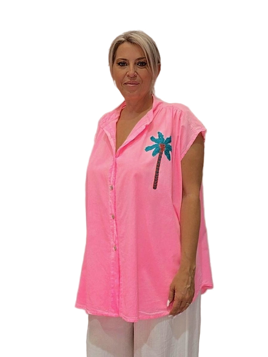 Blusa maxi sin mangas con cuello MAO y cierre de botones, decorada con una divertida palmera bordada en rosa flúor.