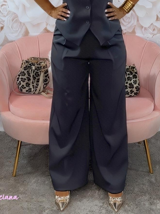 Pantalón ancho con pinza. Cintura delantera lisa. Cintura trasera elástica ajustable. Lleva trabillas para cinturón. Se abrocha con botón y cremallera.