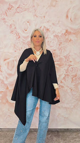 Poncho asimétrico de líneas minimalistas, perfecto para entretiempo o como capa ligera.