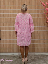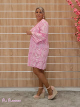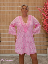 Vestido playero troquelado y bordado inglés. Con pasamaneria en puño manga y escote. Escote en pico muy pronunciado. Algodón lavado