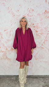 Un vestido cómodo y favorecedor con silueta globo que aporta volumen y movimiento sin perder ligereza. Su escote en V estiliza la parte superior, mientras que las mangas francesas con puño elástico y los bolsillos laterales lo convierten en una prenda práctica y muy versátil para el día a día.