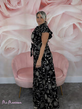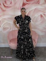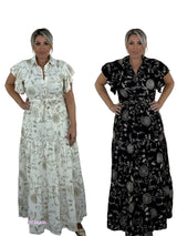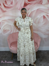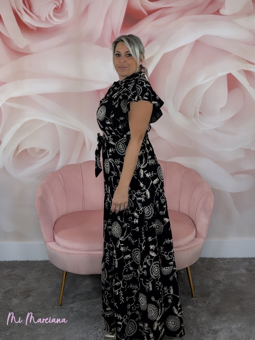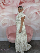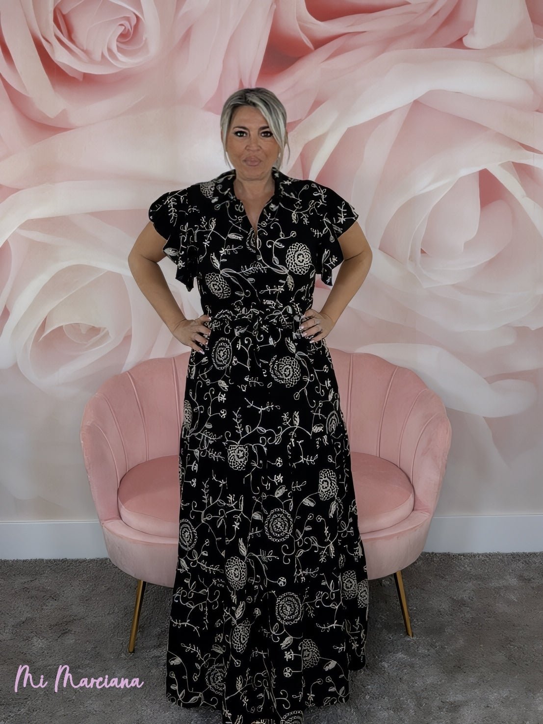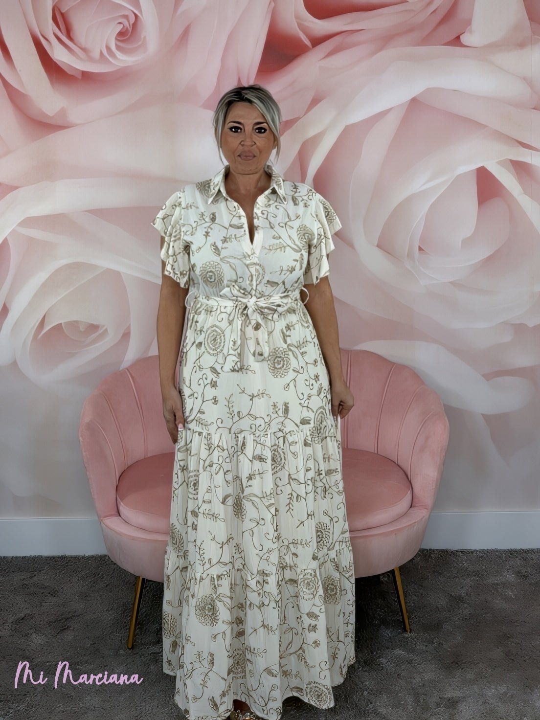 Vestido largo con bordados dorados y volantes. Botonadura hasta la cintura. Mangas con volantes. Cintura elástica. Lleva cinturón