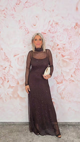 Un vestido largo de tul con brillo integrado que aporta un efecto elegante, sensual y muy especial. Lleva un vestido interior a modo de forro que aporta comodidad, mientras el tul exterior con strass cubre todo el diseño.