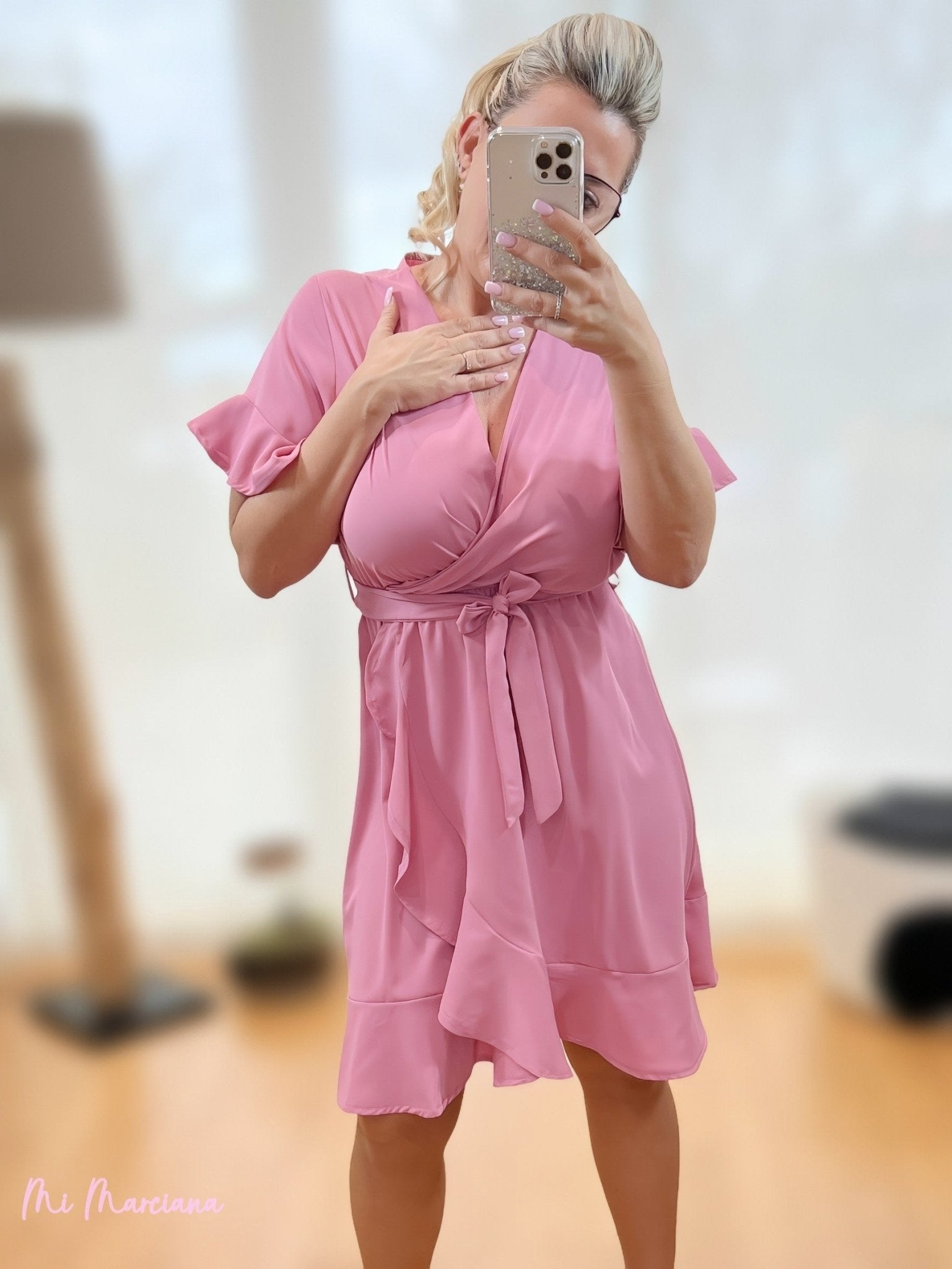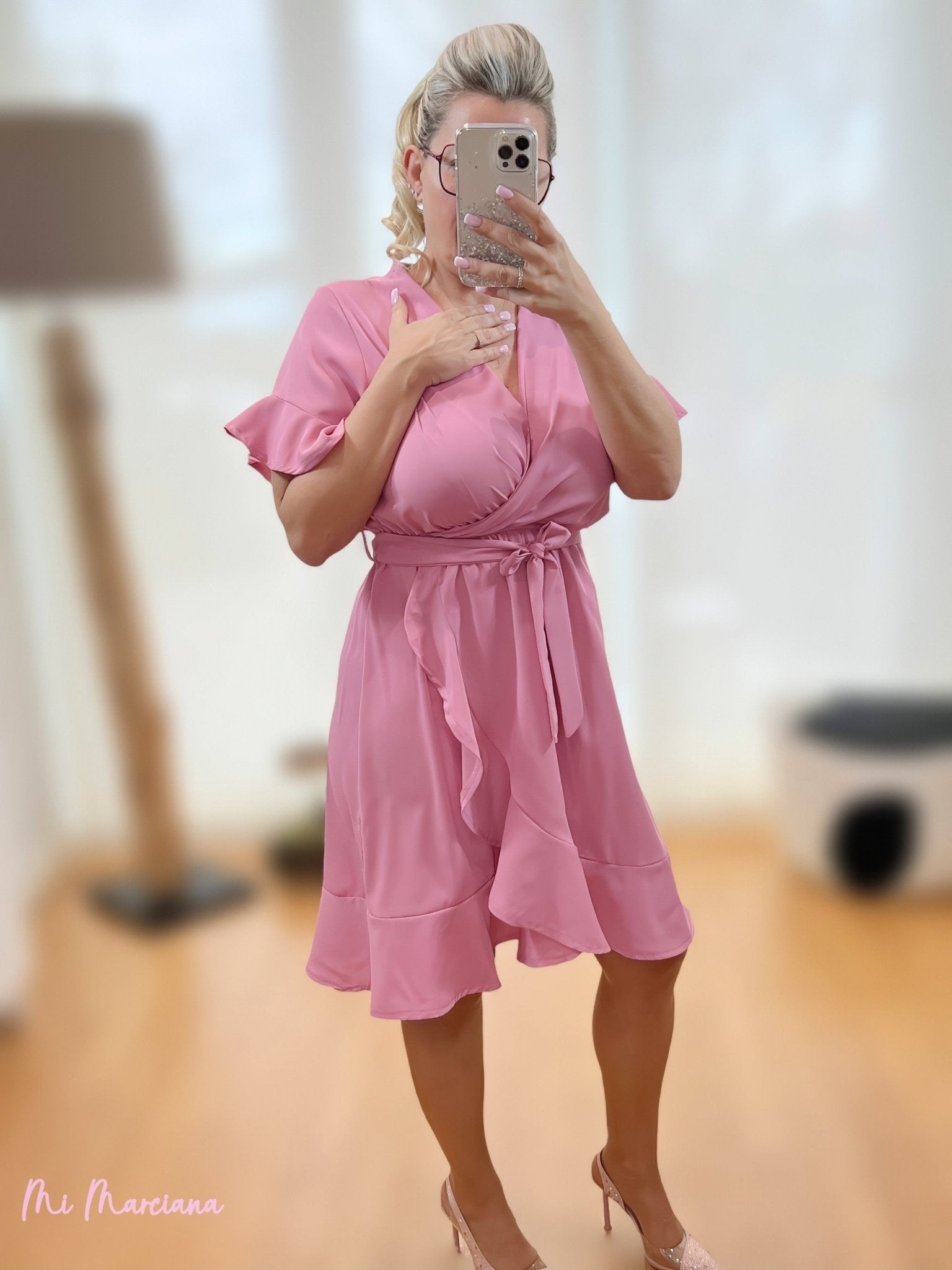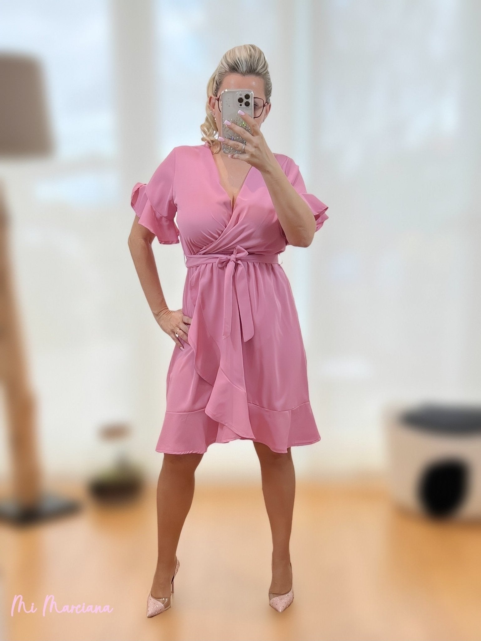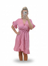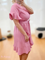 Vestido volantes cruzado frambuesa. Escote pico. Volantes en bajo y mangas. Cinturón misma tela.