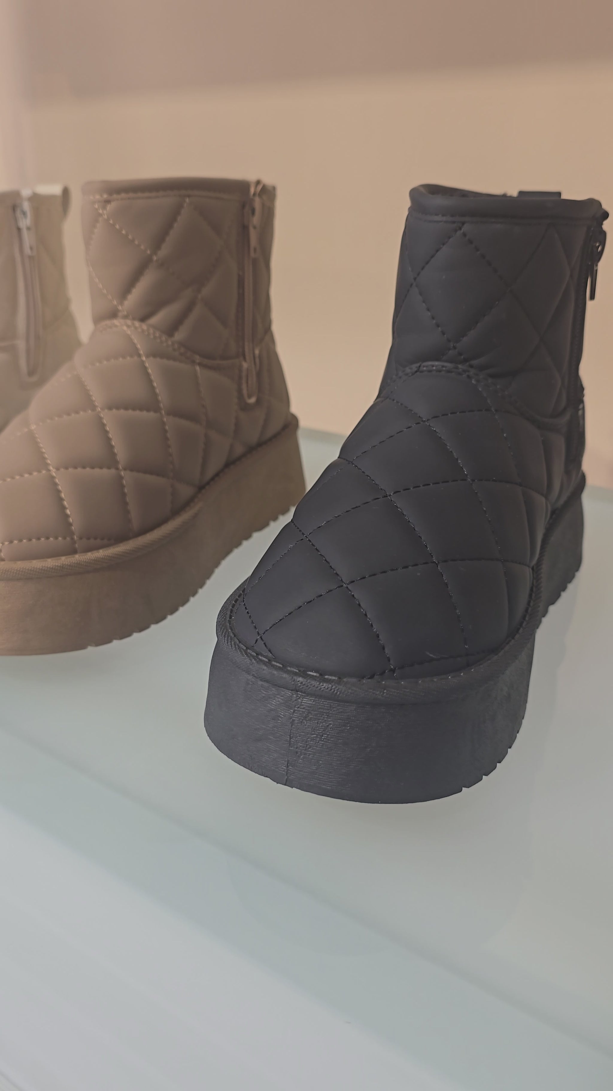 Uma botinha de inverno super macia, quente e confortável, ideal para os dias frios e chuvosos. O seu design acolchoado proporciona estilo e conforto, enquanto o forro de sherpa mantém os pés sempre quentes. Perfeita para combinar com looks casuais, desportivos ou urbanos.