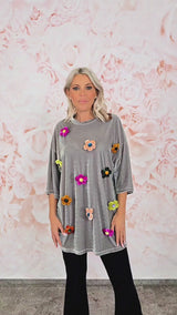 ESTILO: T-shirt oversized em veludo com aplicações florais coloridas.