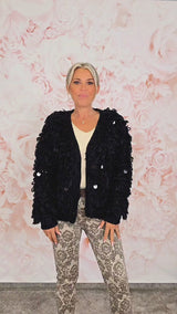 Um design artesanal com textura e brilho. Esta camisola combina o charme do tricô grosso com aplicações de lantejoulas iridescentes, criando um efeito luminoso e festivo, perfeito para se destacar em qualquer ocasião.