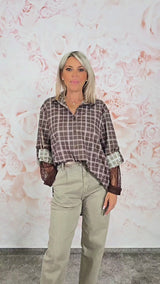 Uma camisa com personalidade própria, que combina um padrão clássico de xadrez com delicados detalhes em renda nas mangas. O seu corte assimétrico, mais comprido na parte de trás, acrescenta movimento e um toque descontraído, mas sofisticado, perfeito para elevar looks casuais com um toque especial.