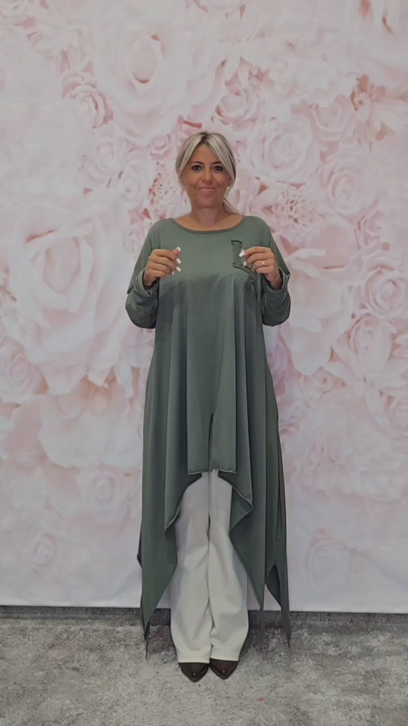 T-shirt maxi de estilo urbano com design assimétrico, perfeita para um look confortável e moderno. Confecionada em tecido fluido e elástico, destaca-se pela bainha irregular e pelo bordado "LA" na frente, conferindo-lhe um aspeto moderno e casual. Inclui bolsos funcionais que a tornam prática e elegante. Ideal para combinar com jeans, leggings ou calças jogger.