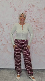 Frescas e cheias de personalidade, estas calças harém em cetim com estampado às bolinhas combinam conforto e estilo na medida certa. O cós e a bainha largos e elásticos garantem liberdade de movimentos, enquanto o tecido acetinado confere um acabamento fluído e elegante. Ideais para looks do dia a dia com um toque retro e chique.