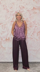 Um design elegante e fluido com um toque de classe. Esta calça de cetim acrescenta movimento e brilho subtil, enquanto o detalhe de renda na bainha acrescenta um toque sofisticado e feminino.