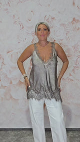 Delicada e sofisticada, esta camisola JOT é confecionada em tecido acetinado fluido com acabamento brilhante. Apresenta um decote em V adornado com renda fina e um acabamento recortado na bainha, conferindo um toque romântico e feminino. Uma peça versátil para usar sozinha ou por baixo de blazers e casacos, é perfeita para elevar qualquer look.