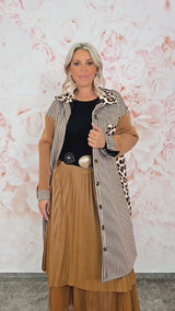 Um design moderno e versátil que combina o estilo de uma camisa com um tecido de neoprene leve e confortável. A mistura de riscas e animal print confere um toque contemporâneo e atraente, perfeito para usar como vestido ou casaco comprido.